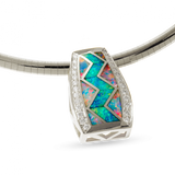Unveil the magic of the Southwest with our River of Love® Large Opal Pendant, a captivating creation by Santa Fe Goldworks. This eye-catching piece showcases a stunning mosaic of Australian blue-green opal and fire opal, reminiscent of a desert sky at twilight. The opals' play of color is accentuated by a border of brilliant diamonds, totaling approximately 0.52 carats. These F color, VS2 clarity stones add a subtle shimmer, like stars emerging at dusk. Measuring 16mm x 25mm, this pendant makes a bold yet elegant statement. Each piece is meticulously crafted, blending the raw beauty of opals with refined jewelry design. Perfect for both special occasions and everyday wear. Note: Chain sold separately, allowing you to customize your wearing experience.