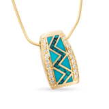 Exude timeless elegance with the Small River of Love® Pendant by Santa Fe Goldworks. Featuring a sleek inlay of turquoise and opal, the striking chevron design is framed by two rows of sparkling pavé diamonds, totaling .22 carats. These round brilliant diamonds, F in color and VS1 in clarity, create a beautiful contrast against the vivid stones and warm 14k gold, offering a refined yet bold look.