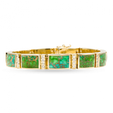 A regal bracelet, our link bracelet with pavè diamonds is meticulously hand-inlaid with exquisite Royston Turquoise, which is admired for its vibrant hues of green and blue and graced with an intricate golden brown pattern. Dazzling handset round brilliant pavè diamonds totaling .88TDW, F in color, and VS1in clarity are featured in between each Royston Turquoise link. Crafted in 14 karat gold. This bracelet measures 9mm X 13mm. Available in white or yellow gold. Also available in Sleeping Beauty Turquoise and Onyx by special order. Please contact a sales associate for information and pricing for special orders.